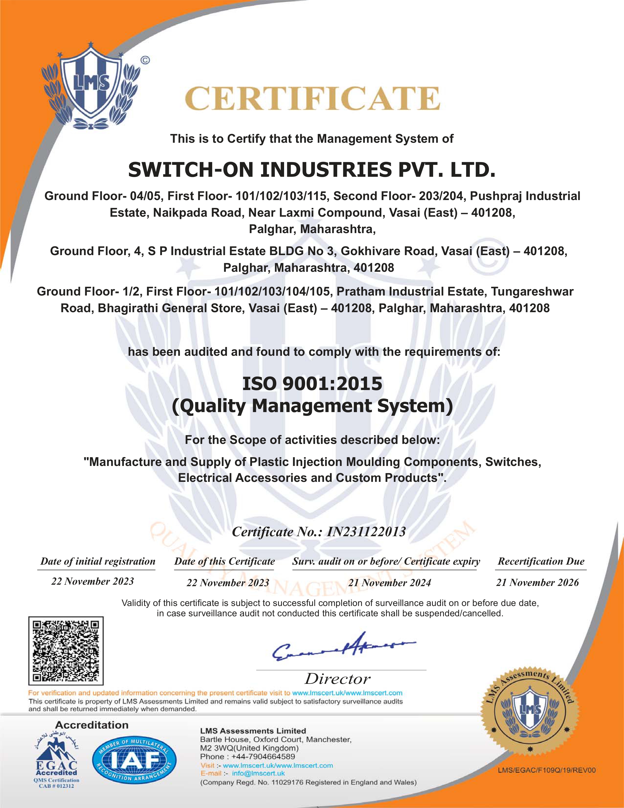 SWITCH-ON INDUSTRIES PVT. LTD. Quality certification is a symbol of our commitment to deliver electrical solutions of the highest standard. We are proud to attain and maintain certifications such as ISO 9001:2015 (Quality Management System), which show that we adhere to a robust quality management system. It represents not only technical expertise, but also a deep understanding of safety protocols, regulatory compliance and a commitment to continuous improvement. Manufacturing and supplying plastic injection moulded components, switches, Electrical accessories and customised products Our certified professionals are the cornerstone of our reputation for reliability and excellence in the electrical industry.